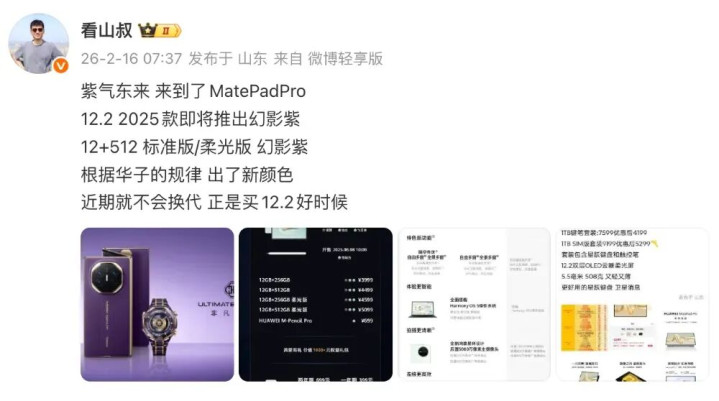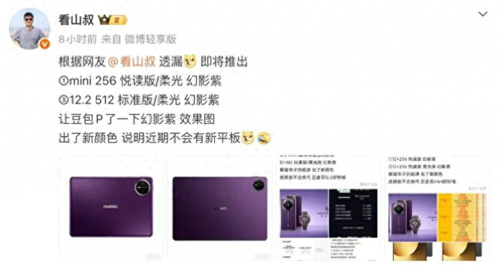 博主爆料华为MatePad Mini和MatePad Pro 12.2将新增幻影紫配色,且明确近期无全新平板发布。这一操作并非偶然,而是华为在平板阛阓增长放缓下的典型战略。