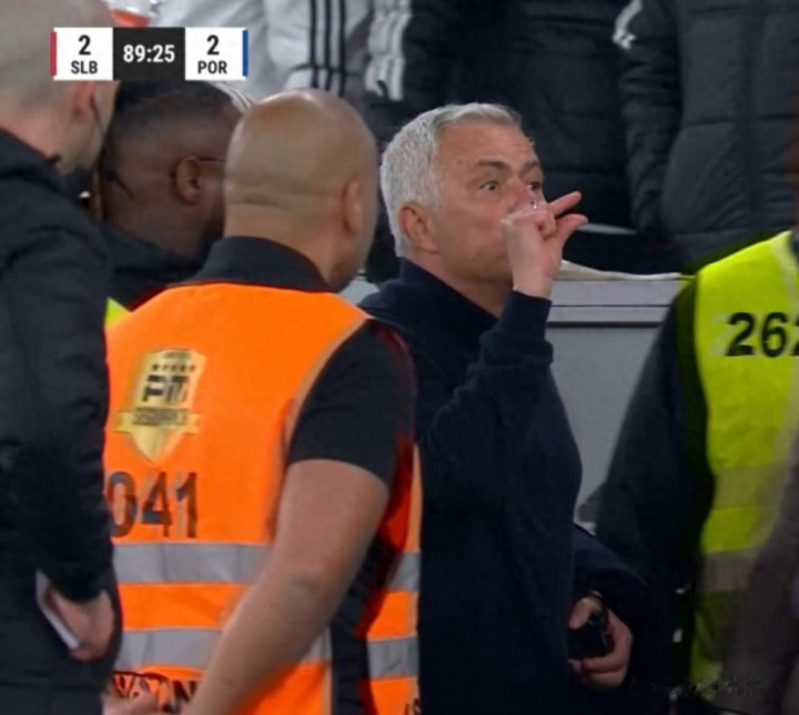 葡超第25轮葡萄牙国度德比,本菲卡2-2波尔图,比赛第90分钟,穆里尼奥在飞踢水瓶后被裁判出示红牌罚出,离场时还对波尔图球员比手势。