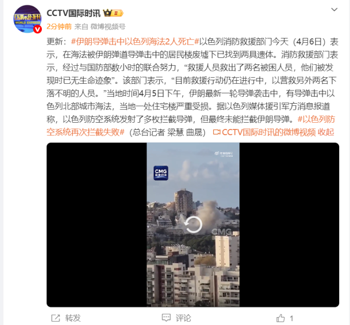 当地时辰4月5日下昼,伊朗最新一轮导弹紧迫中,有导弹击中以色列北部城市海法,当地一处住宅楼严重受损。据以色列媒体征引军方音问报谈称,以色列防空系统辐射了多枚阻挠导弹,但最终未能阻挠伊朗导弹。