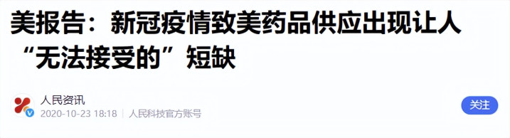 3.《美报告:新冠疫情致美药品供应出现让人“无法接受的”短缺》2020-10-23 18:18 | 来源:人民资讯