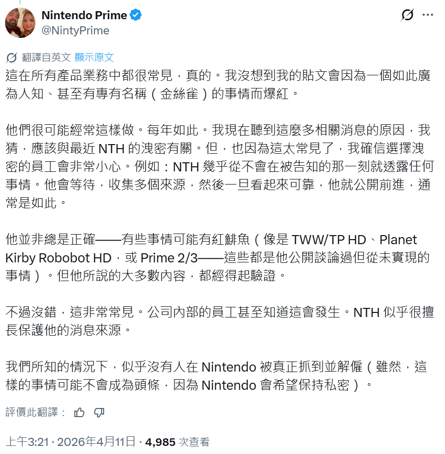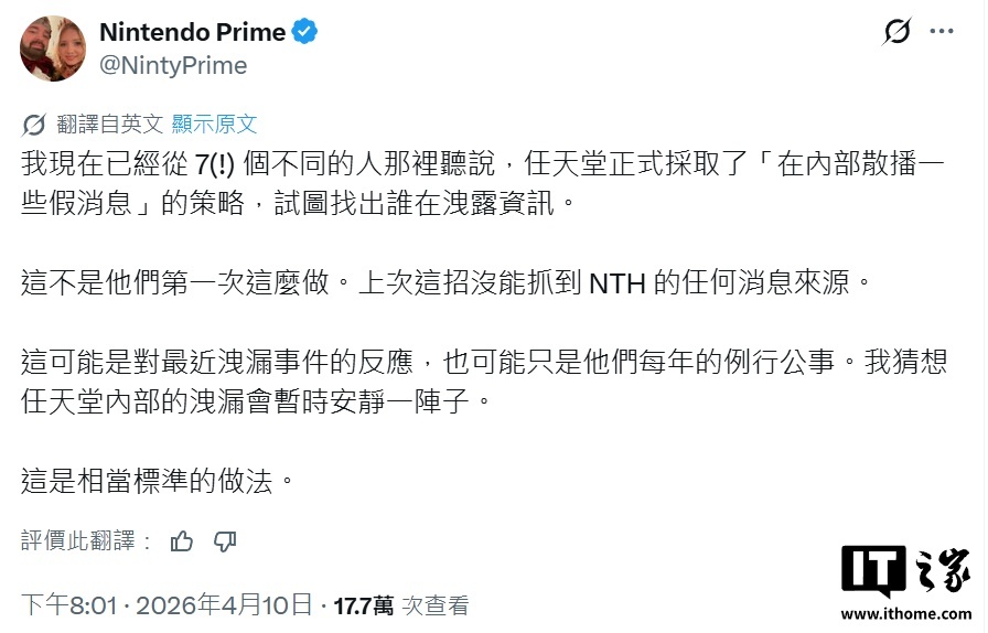 4 月 12 日音书,音书东说念主士 Nintendo Prime 前天在 X 平台示意,他依然从 7 东说念主口美妙说,任天国依然罗致里面散布“假音书”的步伐找出泄密者。
