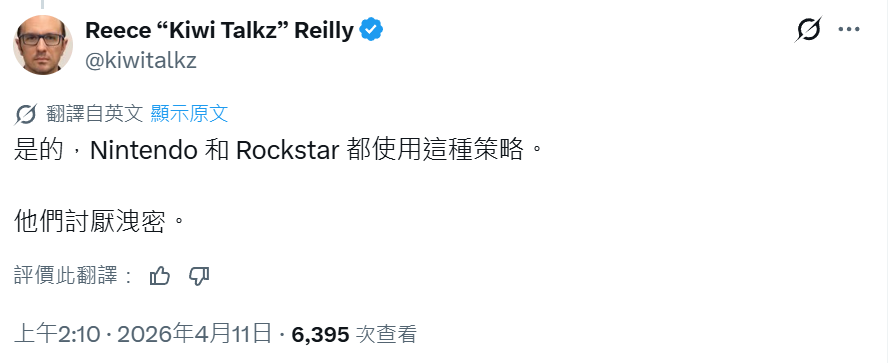 另别称音书东说念主士 Kiwi Talkz 回复说念:“是的,任天国和 R 星齐罗致这种战略合手内鬼,他们厌烦泄密”。
