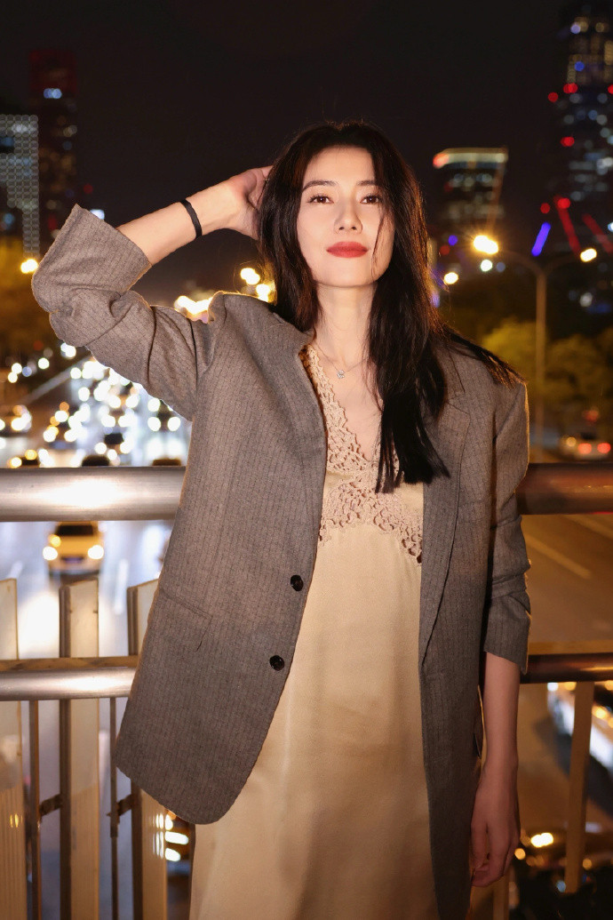 高圆圆身穿灰色西装,给人一种硬朗又大气的感觉,而内搭的蕾丝吊带裙则尽显柔美!两种风格的服饰碰撞出独特气质,在都市霓虹的映衬下,既有都市女性的干练利落,又藏着不经意的性感。