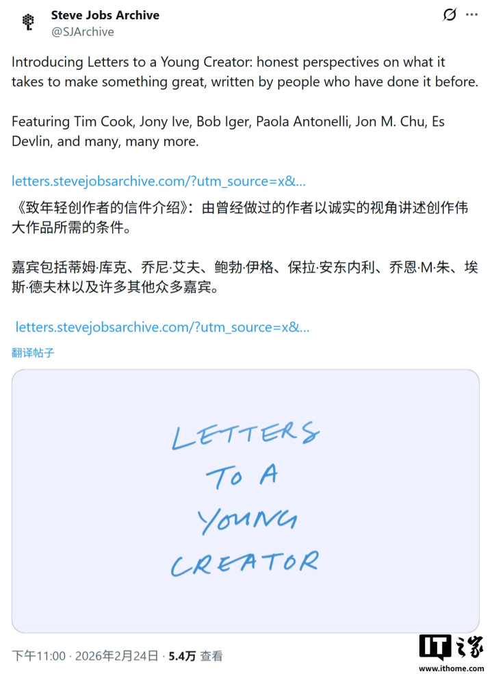 IT之家2月25日音讯,在苹果都集首创东谈主史蒂夫·乔布斯(SteveJobs)71岁冥诞之际,史蒂夫·乔布斯档案馆发布全新免费文集《给年青创作者的信》(LetterstoaYoungCreator)。