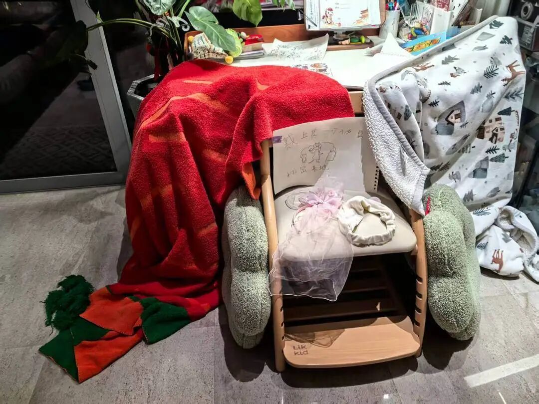 而在客厅一角,本来整皆的一张书桌被改形成了“安全屋”。悠悠用两块大毯子搭起一个帐篷,内部铺着靠垫,塞满了零食,一把椅子算进口,椅背上贴着一张白纸,手写晓谕:“玄妙基地,戴上其一可入内”,椅子坐垫上放着几个发箍。