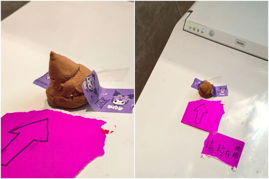 姆妈陈女士排闼进去,一眼看到马桶盖上,端方法正摆着一坨用黄色橡皮泥执的“便便”,傍边还贴着一张纸,纸上歪七扭八写着:“请拉在此处”。