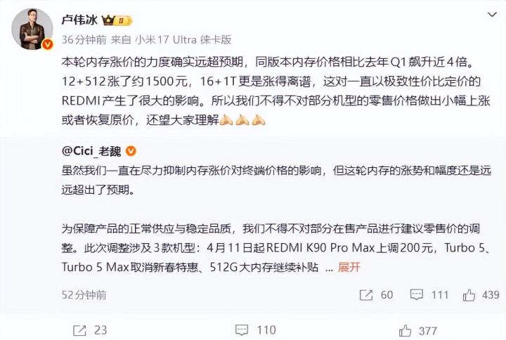 4月3日,总裁卢伟冰在微博发文暗示,本轮内存加价的力度如实远超预期,同版块内存价钱比较旧年Q1飙升近4倍。12+512涨了约1500元,16+1T更是涨得离谱,这对一直以极致性价比订价的REDMI产生了很大的影响。是以不得分手部分机型的零卖价钱作念出小幅高涨或者恢收复价。