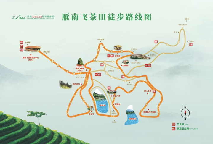 “循着茶香去旅行”的徒步阶梯如下:雁南飞旅客办事中心(起首)→雁南飞神石→锦绣茶田→望茶亭→雁南飞神石→雁鹅湖→不雅景台→茶艺东说念主家→金桂路→茶东说念主之家→莲塘映月→茶花大不雅园→茶东说念主之家→茶田正途→丰充茶园→别墅区→茶情阁→雁南飞正途→雁南飞神石(尽头)。