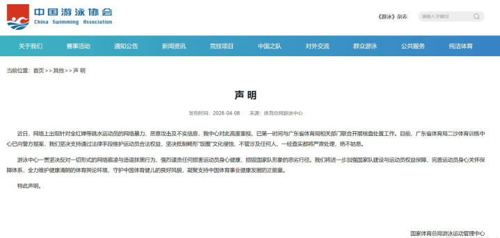 事件发酵后,官方马上发声撑腰。国度体育总局游水中心与广东省二沙体育检修中心纠合声明,已就遭网暴事件向警方报案,强项防范通顺员正当职权,维持通过法律技巧维权。