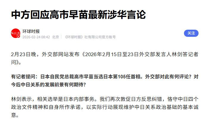 2月23日,酬酢部发言东说念主林剑在例行记者会上,针对高市早苗的施政演说,给出了明确、坚忍的文告,这番文告被酬酢部网站幽静发布,措辞不长,但重量发愤。