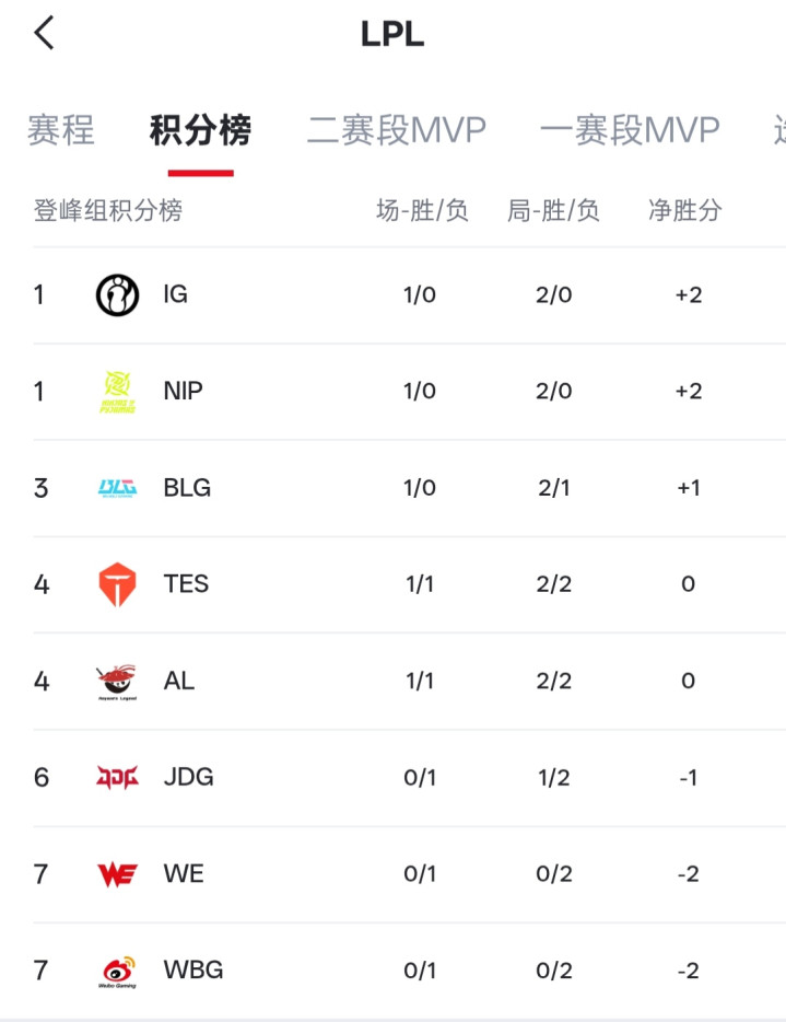 虎扑04月06日讯LPL昨日比赛截止,赛后最新LPL战队名次如下图: