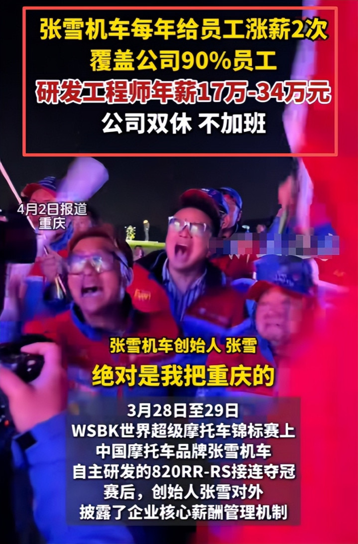 张雪公司一年给90%的职工涨薪两次。