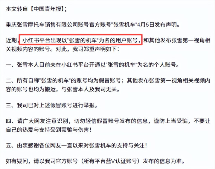 4月6日,张雪机车官方发文称某平台的账号为假冒。
