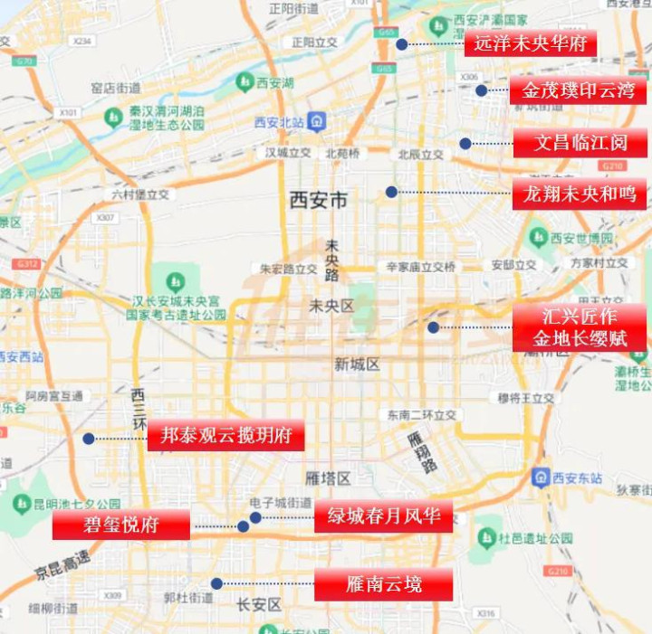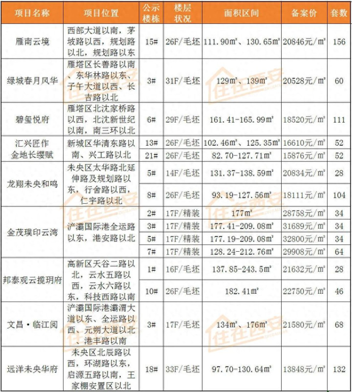 价钱公示形貌分辨为雁塔区的雁南云境、绿城春月风华、碧玺悦府,新城区的汇兴匠作金地长缨赋,未央区的龙翔未央和鸣、远洋未央华府,浐灞国外港的金茂璞印云湾、文昌·临江阅,高新区的邦泰不雅云揽玥府。